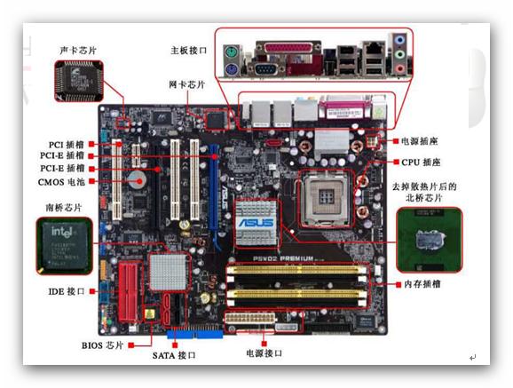 了解主板的各个部件,如CPU插槽、内存插槽、PCI插槽、南桥和北桥芯片等。